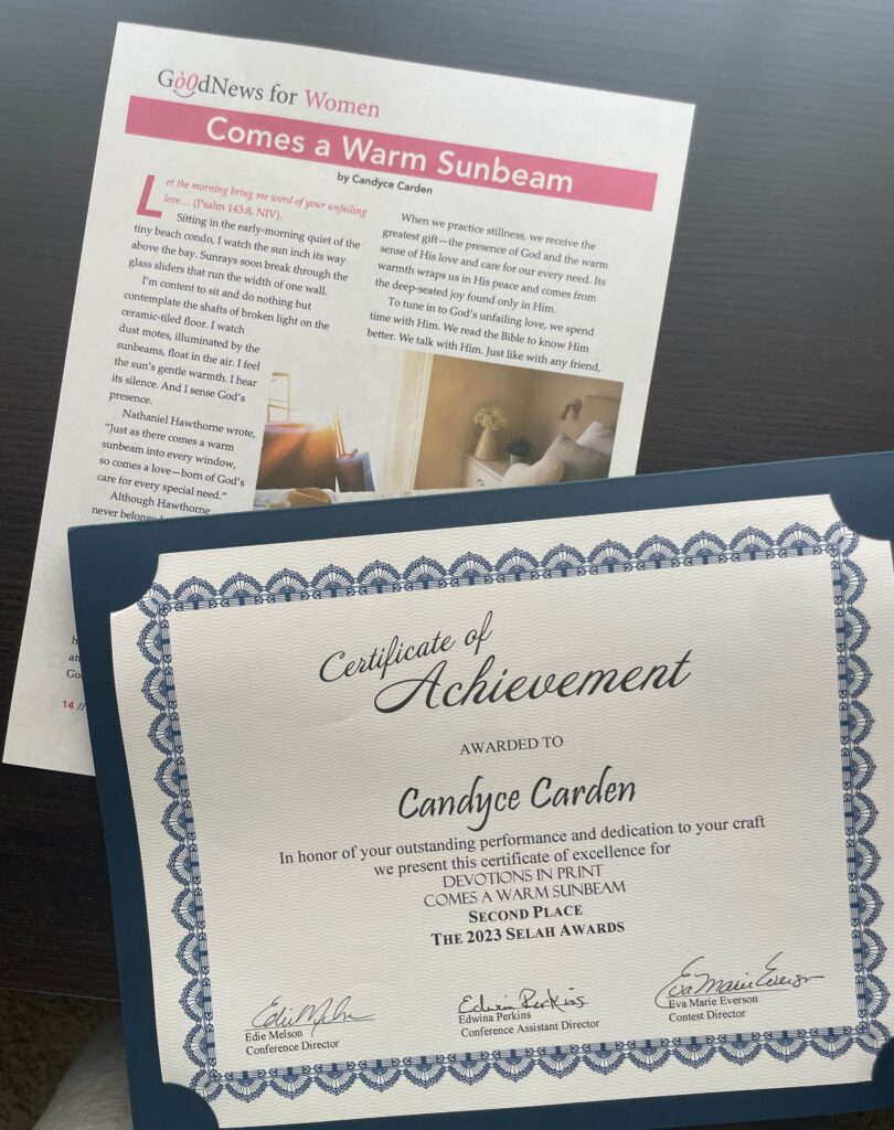 I mentioned in my spring newsletter that I was a Selah finalist for my devotion, “Comes a Warm Sunbeam.” I’m happy to announce it won second place!