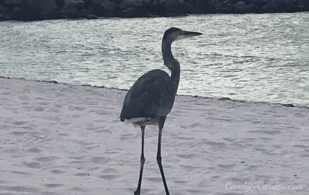 I didn’t see the crane when I first climbed onto the jetty. I stilled, so as not to startle him. The sandhill crane is a strange bird. His legs are a mile long and his neck isn’t much shorter. A patch of bald red skin atop his head contrasts sharply with his ashy-gray feathers.