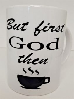 Each new year, I ask God to reveal an area in which I need personal growth. Usually it’s a single word. This year, I believe God gave me this twist on the phrase featured on my old mug: But First, God.