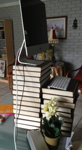 I double-stacked an old set of Encyclopedia Britannica atop my desk and spent the morning revising a 2,500-word article while standing. It took a little while, but I eventually got ‘in the flow’ and it became easier. My brain forgot all about the body’s vertical status and adequately reworked the piece, but man was I tired when finished.